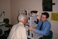 at the camera, seated with your chin resting on the chin-rest and your